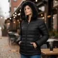 Jaqueta puffer feminina com acolchoado uniforme e capuz com acabamento em pelinho sintético, na cor caramelo.. Fechamento por zíper, bolsos laterais e costuras reforçadas para maior durabilidade. Leve, quente e prática, ideal para dias frios do dia a dia. Combine com jeans, botas e cachecol para um look casual, moderno e acolhedor neste inverno.